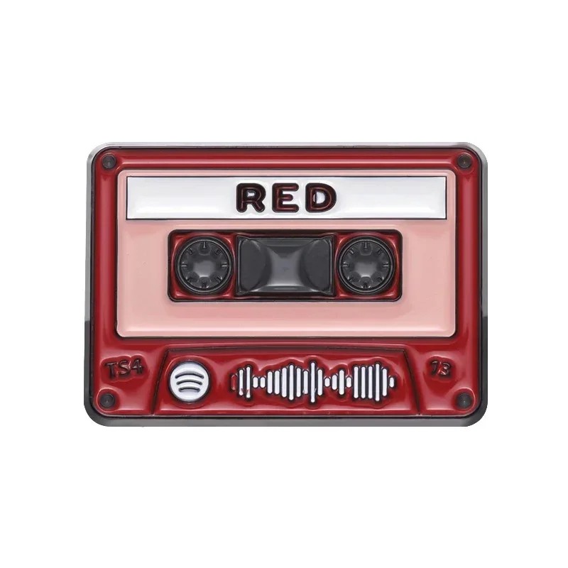 La spilla smaltata a forma di cassetta musicale colpisce per il suo vivace colore rosso e la semplice scritta RED, posizionata nella parte superiore della cassetta. Il design è arricchito da dettagli come le bobine della cassetta e un motivo sonoro stilizzato nella parte inferiore. Grazie a questo, la spilla appare come un'interpretazione moderna della cassetta classica, mantenendo al contempo il suo carattere retro. La combinazione di rosso, nero e bianco crea un contrasto marcato.