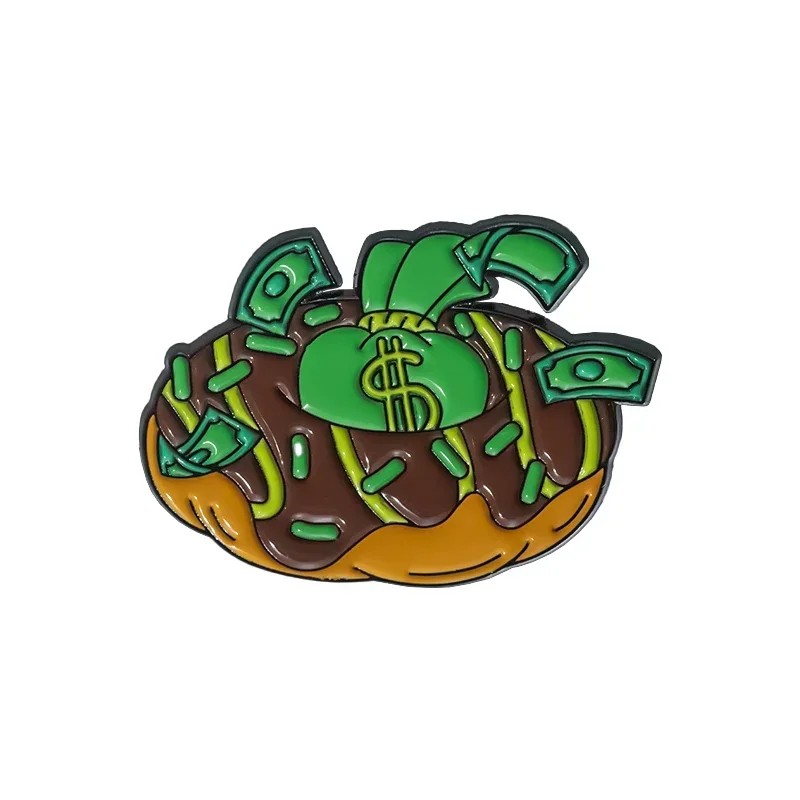 Spilla smaltata a forma di donut con glassa e soldi circa 2,3 × 3,3 cm spilla in metallo distintivo verde marrone per abbigliamento reverso zaino accessorio