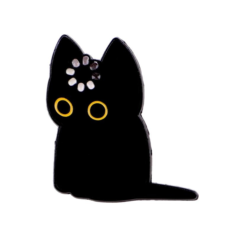 Pin smaltato con gatto nero e simbolo di caricamento sopra la testa. Piccola spilla in metallo adatta per zaino, bavero e abbigliamento come accessorio interessante. Descrizione completa
