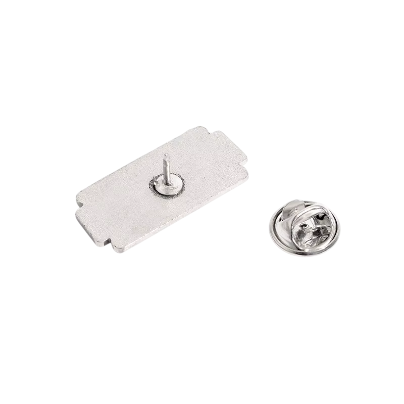 La combinazione di colori unisce uno sfondo nero con dettagli argentati, creando un contrasto marcato. Grazie a questa combinazione, il distintivo risalta su vari tipi di abbigliamento e accessori. La forma allungata ispirata alla žiletto conferisce al design complessivo un aspetto caratteristico.