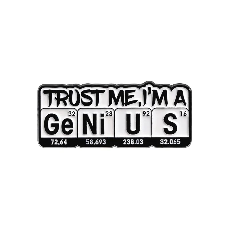 Spilla con la scritta „Trust me I'm a genius“ che utilizza una stilizzazione ispirata alla tabella periodica degli elementi. Le singole lettere sono suddivise in blocchi che ricordano gli elementi chimici, creando un motivo interessante e facilmente riconoscibile. Il design è semplice, ma chiaro e ben leggibile.