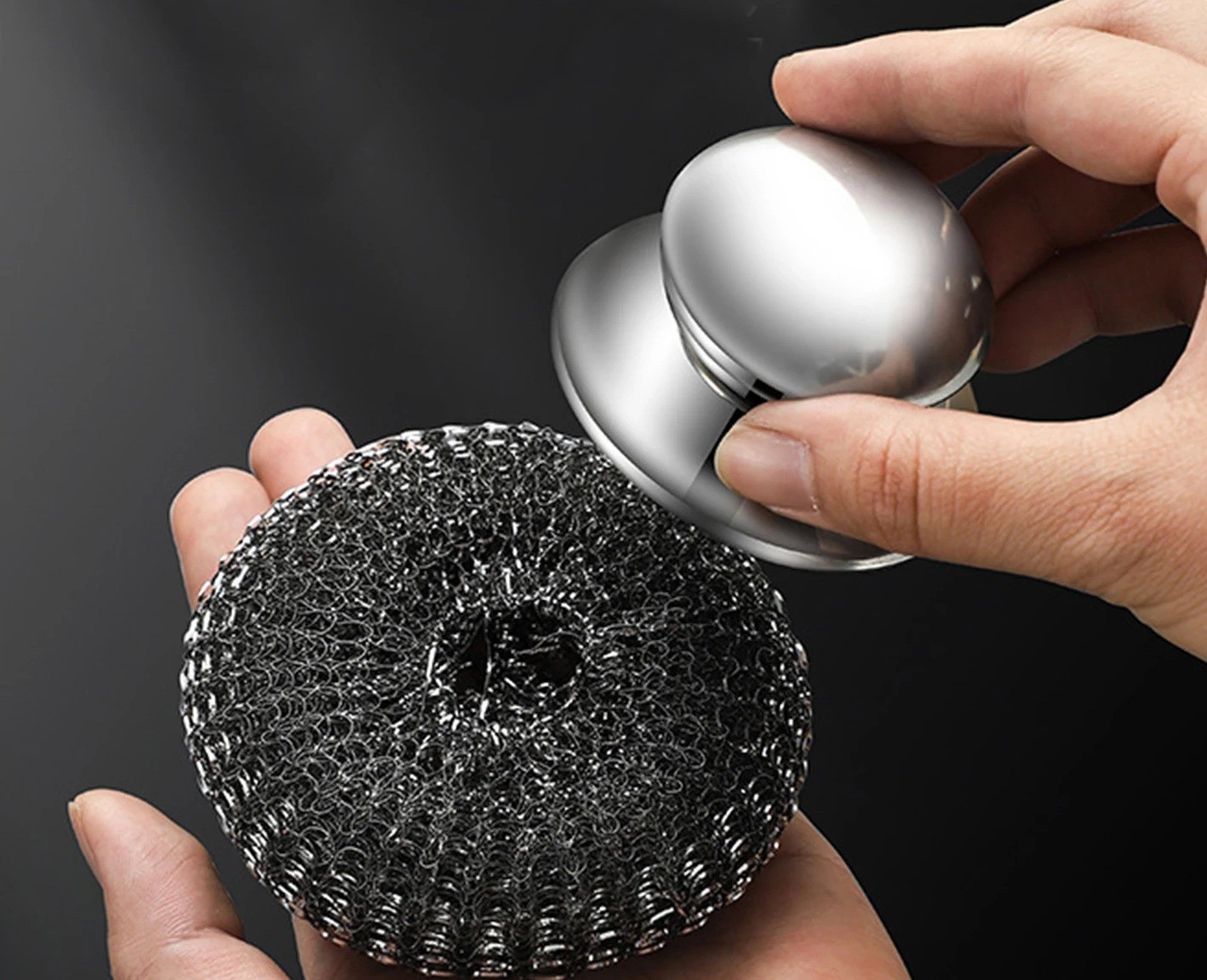 Spugna in acciaio inossidabile resistente con manico per una pulizia facile e approfondita di pentole, padelle e stoviglie fortemente sporche. Descrizione completa