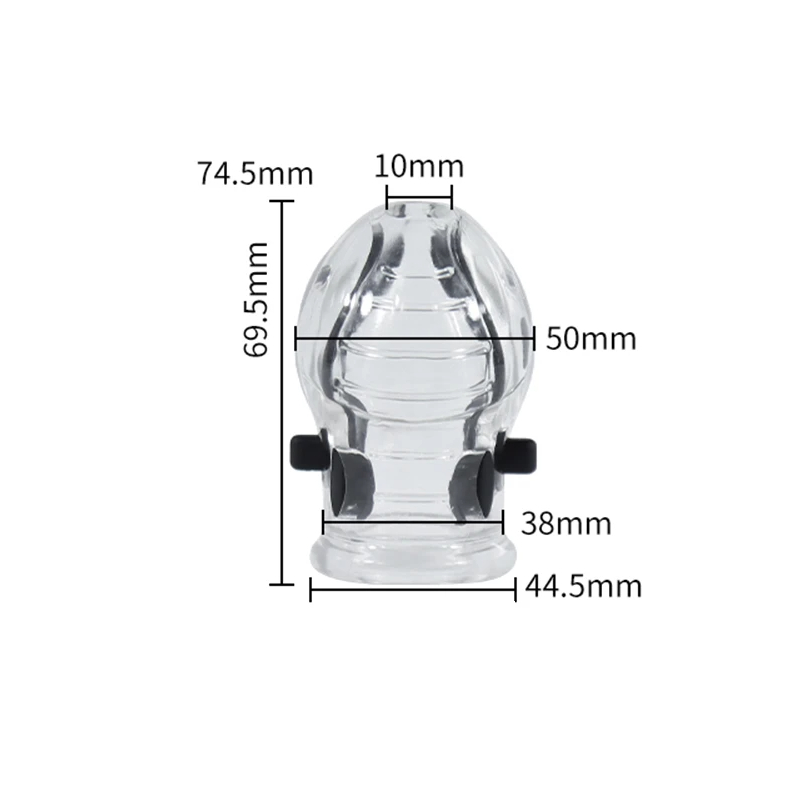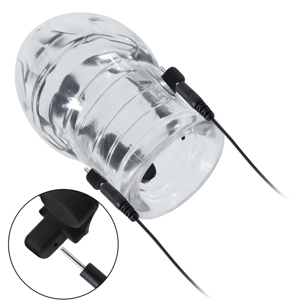 Stimolatore elettrosex trasparente con elettrodi doppi progettato per il glande del pene. Collegamento tramite jack, richiede lubrificante conduttivo. Descrizione completa