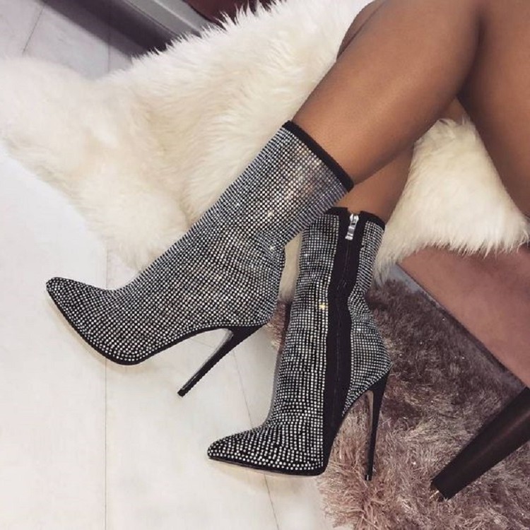 Questi moderni stivali con tacco alto e strass argentati ti conquisteranno.