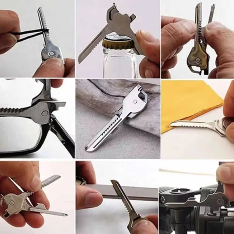 Questo compatto e resistente strumento multifunzionale in acciaio inossidabile è l'ideale compagno per l'uso quotidiano. Grazie alla sua forma che ricorda una comune chiave, può essere facilmente attaccato al mazzo di chiavi e sarà sempre a portata di mano. Include 6 pratici strumenti che puoi utilizzare a casa, al lavoro e in viaggio. È perfetto per piccole riparazioni, apertura di bottiglie o regolazioni degli occhiali. Si adatta perfettamente come regalo per chiunque apprezzi la praticità e il design compatto.