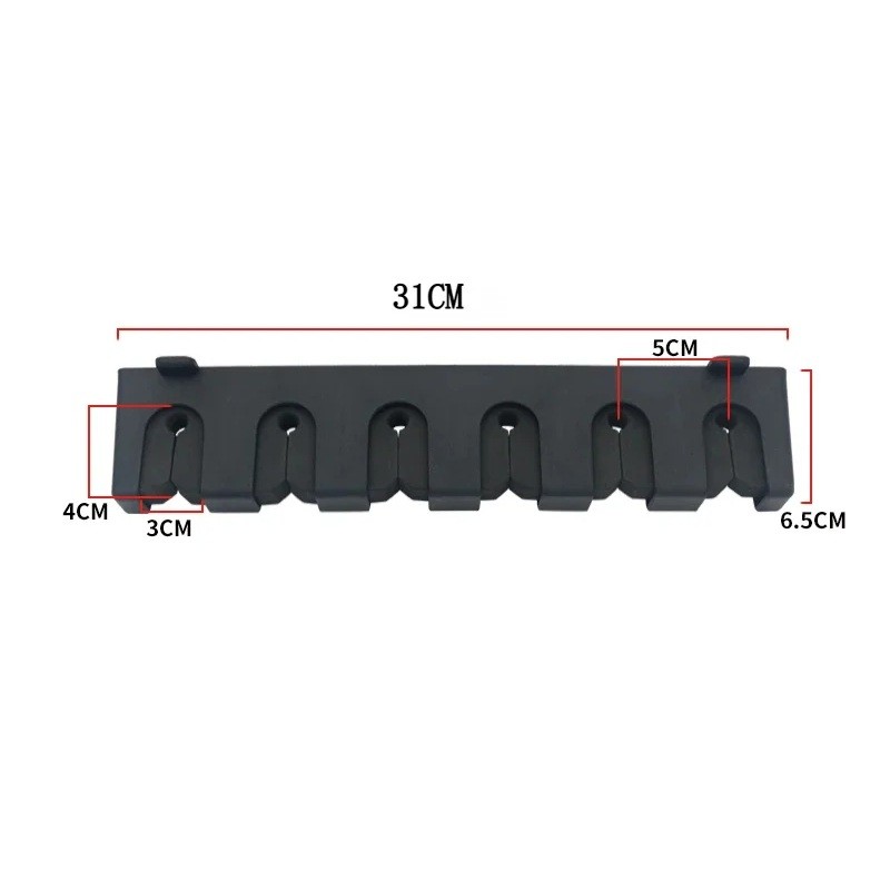 La lunghezza totale del supporto è di circa 31 cm e l'altezza di 6,5 cm. I singoli fori hanno una forma adattata per il fissaggio delle canne, con dimensioni delle singole parti di circa 3–5 cm a seconda della posizione. Questo consente di inserire ed estrarre facilmente le canne senza manovre inutili.
