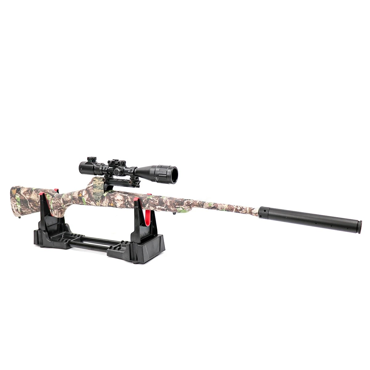 La gamma di lunghezza regolabile da 28 a 45 cm consente di adattarsi a diverse dimensioni di armi. Ciò permette di utilizzare il supporto per vari tipi di deposito senza necessità di ulteriori accessori. La stabilità durante l'uso è garantita dalla base antiscivolo in gomma, che aiuta a mantenere il supporto saldamente in posizione.