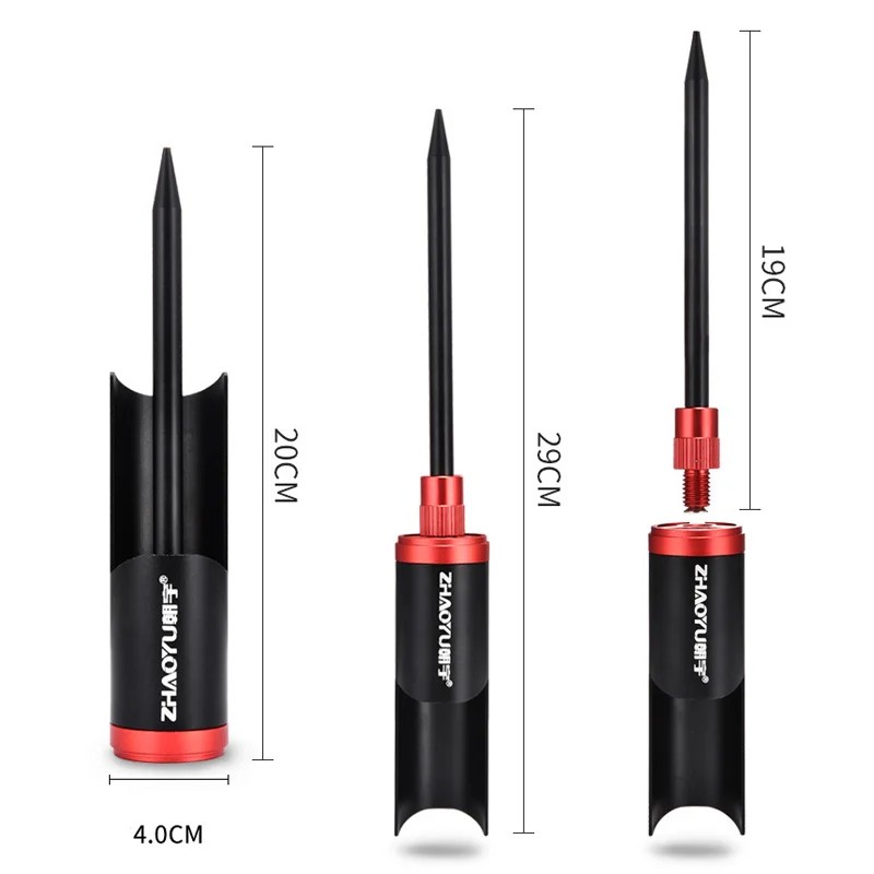 La parte superiore del supporto funge da supporto per la canna, mentre la punta inferiore è destinata a una facile infilatura nel terreno. La combinazione di questi elementi garantisce un utilizzo stabile e pratico durante la pesca.