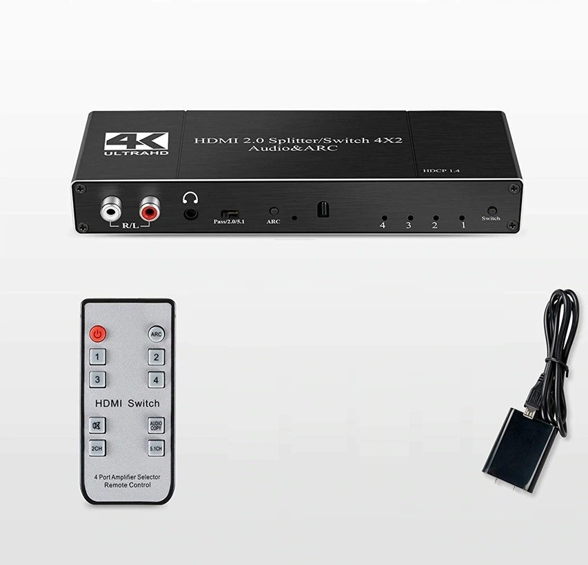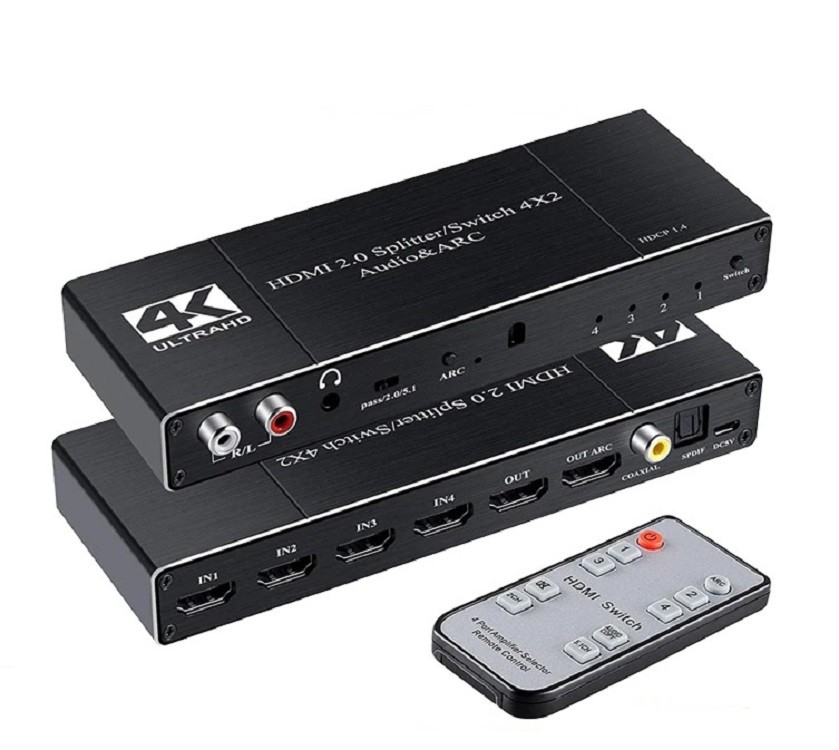 Connettori: 4x ingresso HDMI (femmina), 2x uscita HDMI (femmina), 1x jack coassiale (femmina), 1x uscita ottica, 1x jack da 3,5mm (femmina), 2x jack audio (femmina)