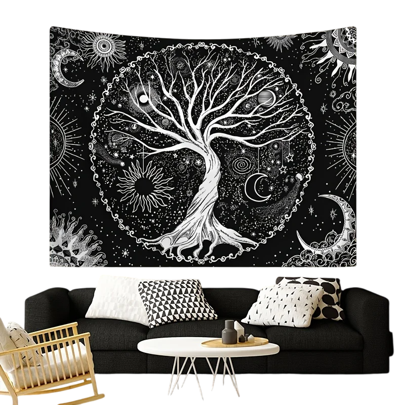 Questo tappeto bohémio nero con elementi mistici dell'albero della vita, sole e luna è l'accessorio ideale per ogni interno con un'atmosfera spirituale o naturale. I motivi collegano la simbologia della vita, dell'equilibrio e dell'universo, portando armonia e tranquillità nello spazio. Il tappeto è realizzato in un materiale leggero e piacevole al tatto, che è anche resistente e facilmente mantenibile – può essere lavato in lavatrice. Si adatta come decorazione per pareti, sfondo dietro il letto o il divano, tendaggio o sfondo in tessuto per le foto. Si distingue perfettamente in camera da letto, angolo meditativo o soggiorno.