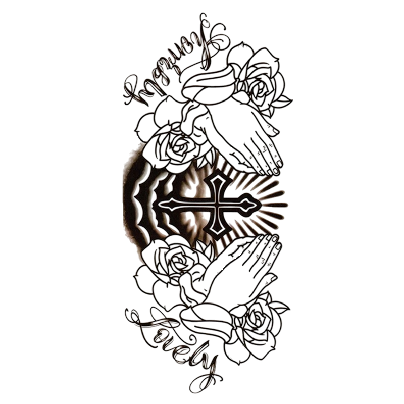 Tatuaggio temporaneo Mani in preghiera e croce 10 x 20 cm Tatuaggio impermeabile per il corpo Simbolo di fede e spiritualità Durata fino a 15 giorni Facile applicazione