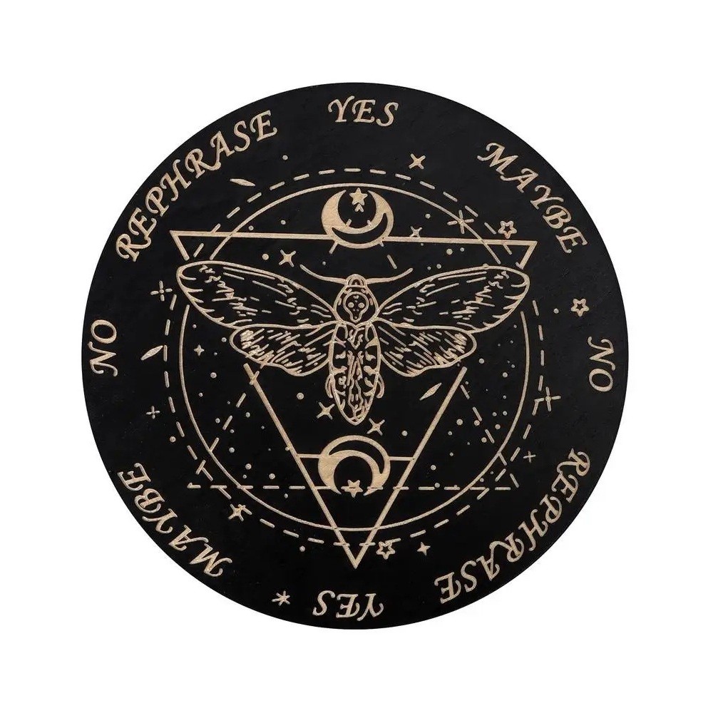 Tabella esoterica in legno con motivo mistico di falena e luna è un'ideale strumento per letture pendolari, meditazione e rituali spirituali. Descrizione completa
