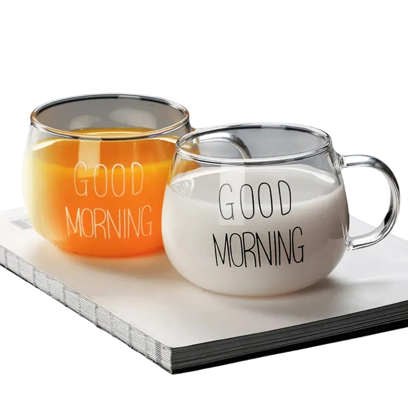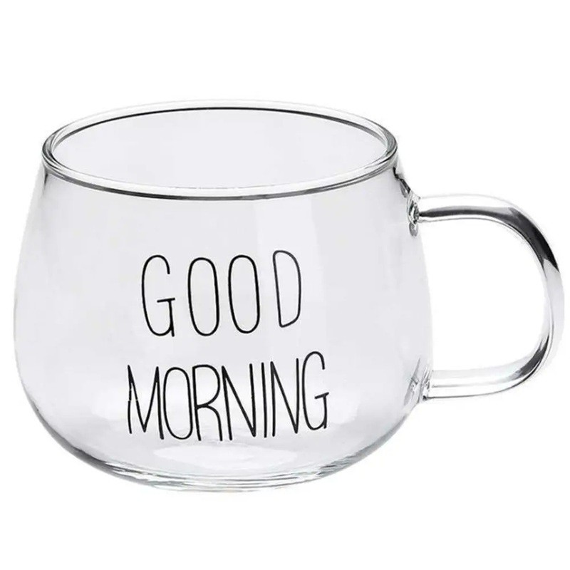 Tazza di vetro trasparente con scritta Good morning 350 ml Tazza con manico 7 x 8,5 cm Tazza di vetro per caffè, tè, cioccolata e smoothie per la colazione