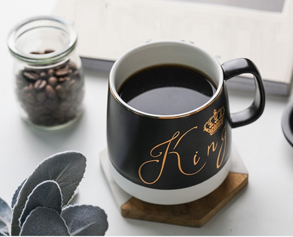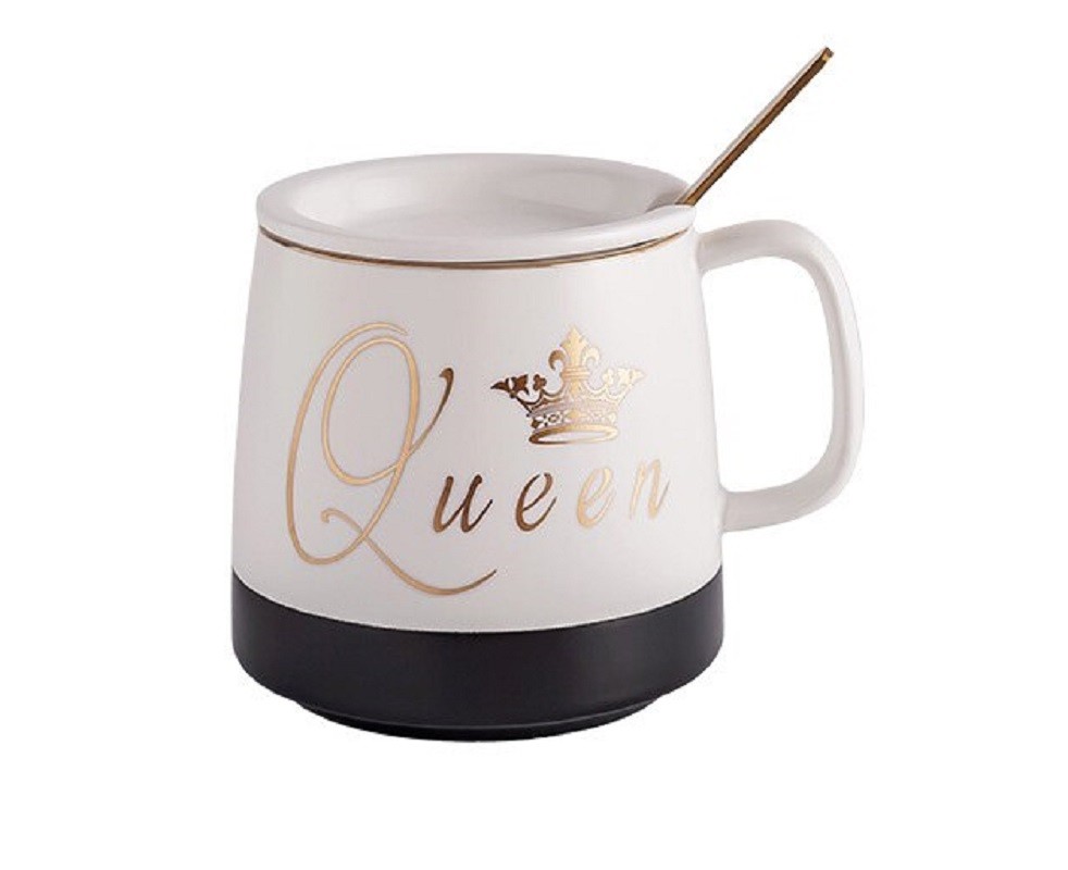 La tazza ha un pratico coperchio e un cucchiaino dorato.