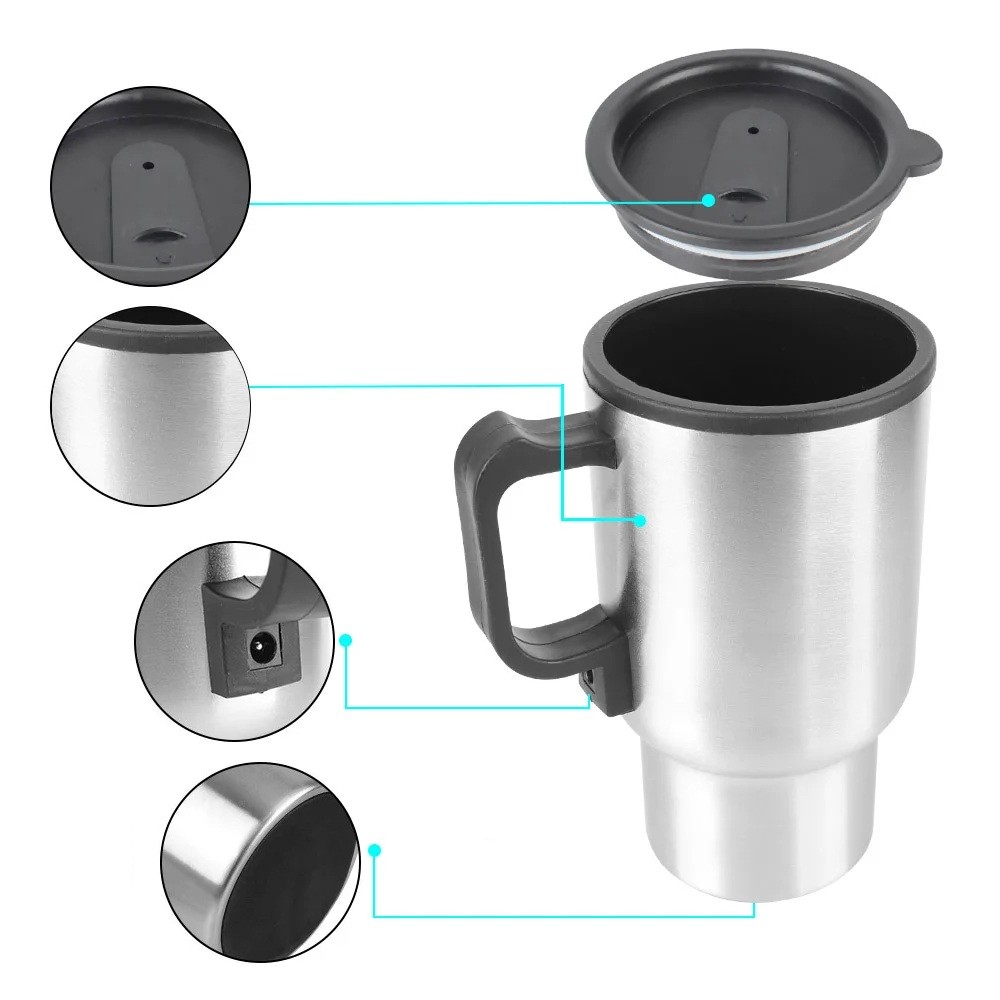 Pratica tazza da viaggio per auto con riscaldamento rapido fino a 65 °C, alimentata dall'accendisigari e con una capacità di 450 ml. Descrizione completa