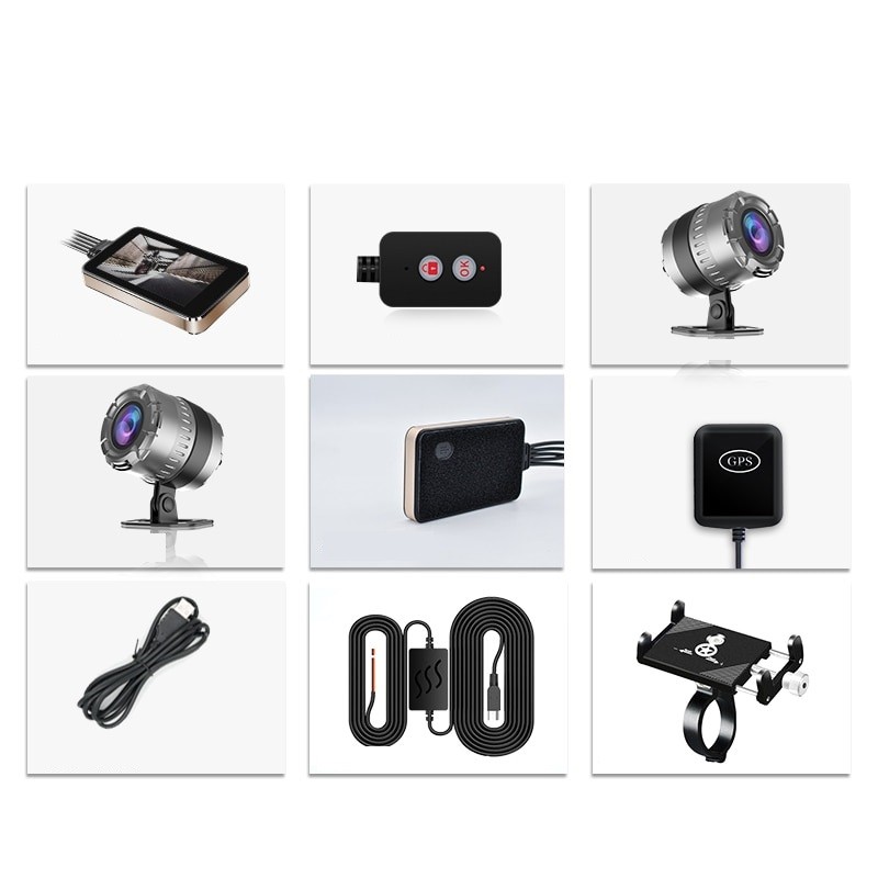 Contenuto della confezione: 1x monitor, 1x telecomando, 1x camera anteriore, 1x camera posteriore, 1x velcro, 1x GPS, 1x cavo USB, 1x Buck Line, 1x supporto