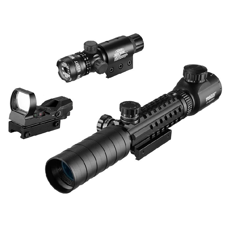 Ingombro: 3-9x. Diametro dell'obiettivo: 32 mm. Diametro dell'oculare: 30 mm. Con collimatore. Laser rosso. Descrizione completa