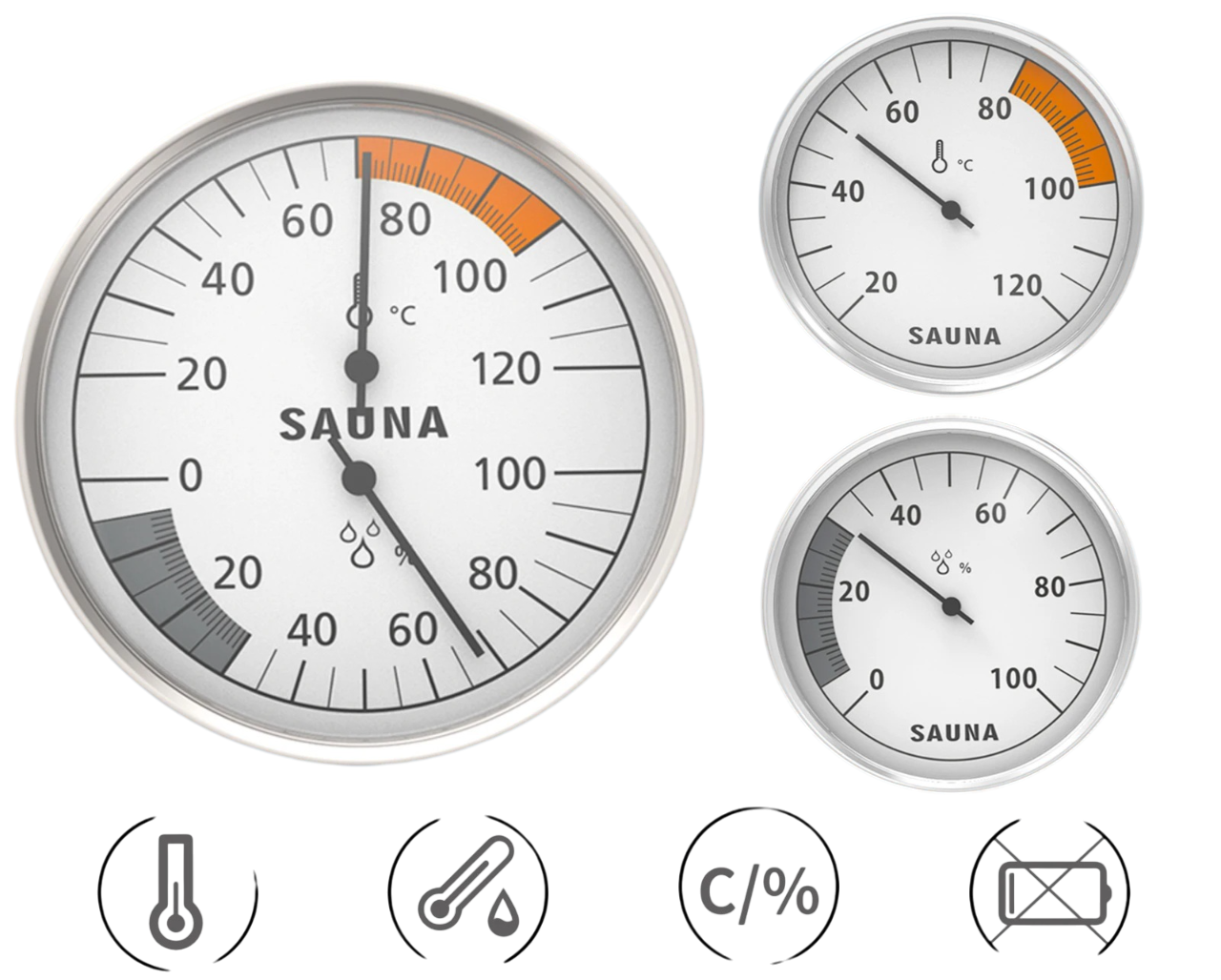 • Termometro e igrometro combinati – misura la temperatura e l'umidità nella sauna per condizioni ottimali.