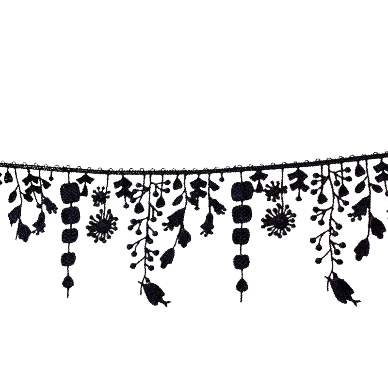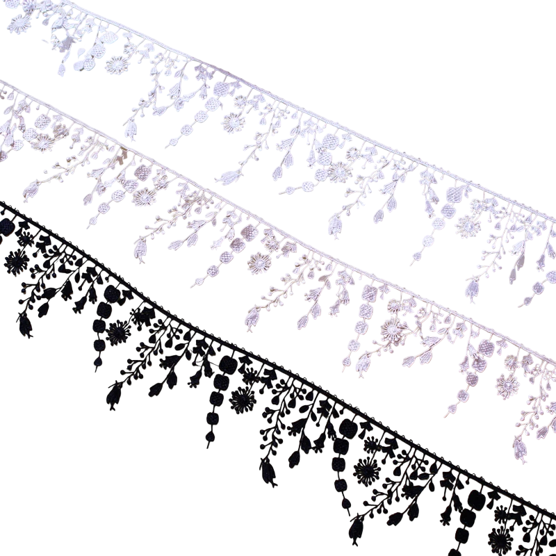 Le frange decorative conferiscono al pizzo un aspetto unico e creano un interessante effetto visivo in movimento. Questo tipo di pizzo è particolarmente amato per decorare abiti da sera, costumi da ballo o abbigliamento scenico. Si presta perfettamente anche per la creazione di accessori moda, come cerchietti, cinture o decorazioni per borse. Il pizzo può essere utilizzato anche per realizzare complementi d'arredo o per creare decorazioni festive per vari eventi.