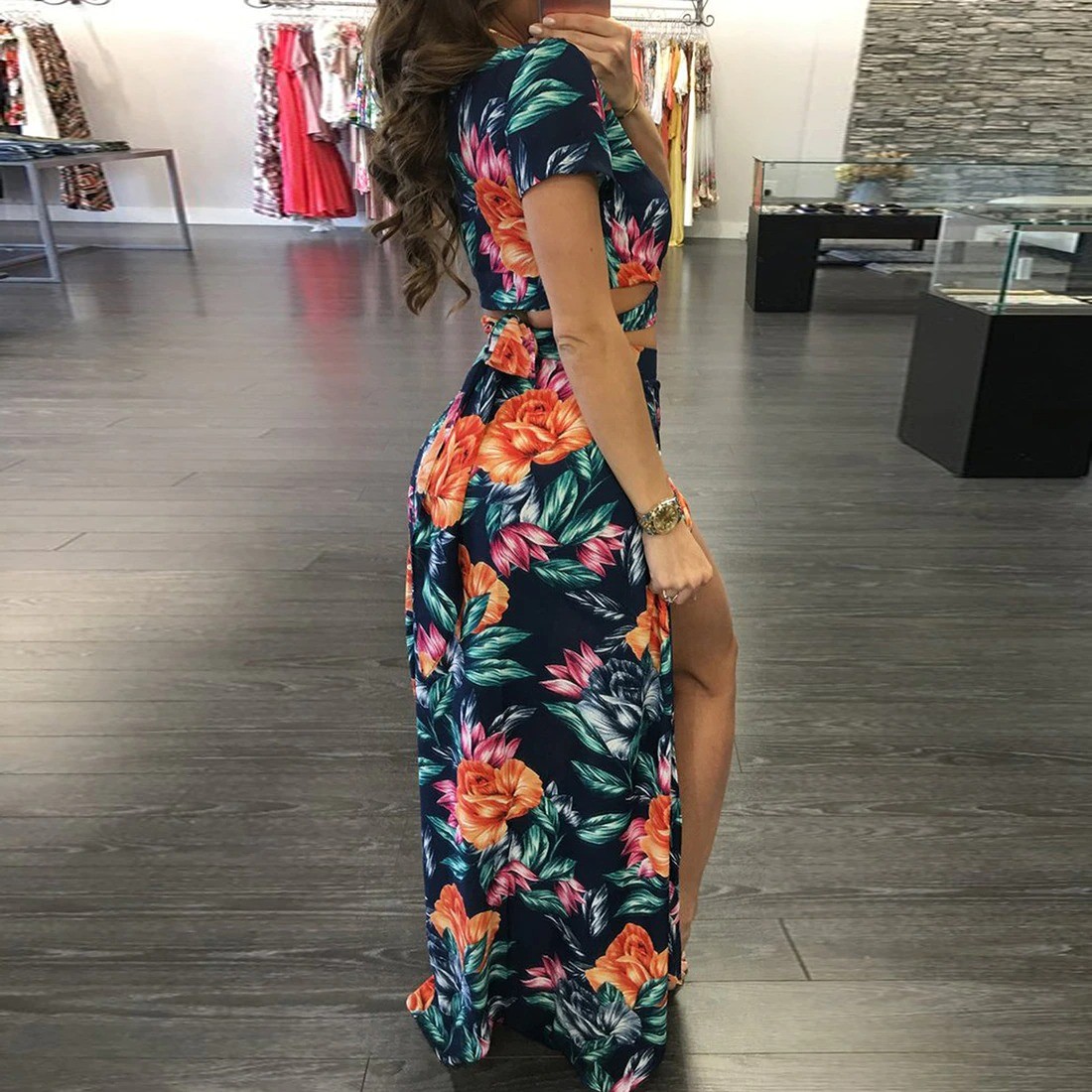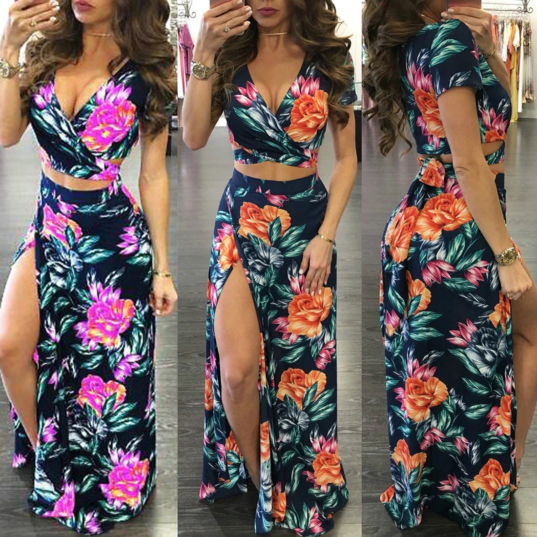 Top corto floreale da donna e gonna