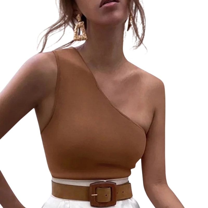 Top asimmetrico monocromatico in stile crop, materiale leggero e confortevole, scelta ideale per l'estate, tempo libero, città e outfit alla moda. Descrizione completa