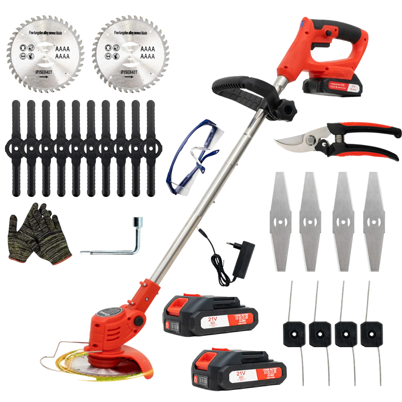 1× tosaerba, 2× batterie 21V (3000 mAh), 1× caricabatterie (spina EU), 5× lame metalliche, 10× lame plastiche, 2× dischi da taglio diamantati, 4× teste a filo, 1× forbici per rami, 1× occhiali protettivi, 1× guanti da lavoro, 1× chiave a brugola