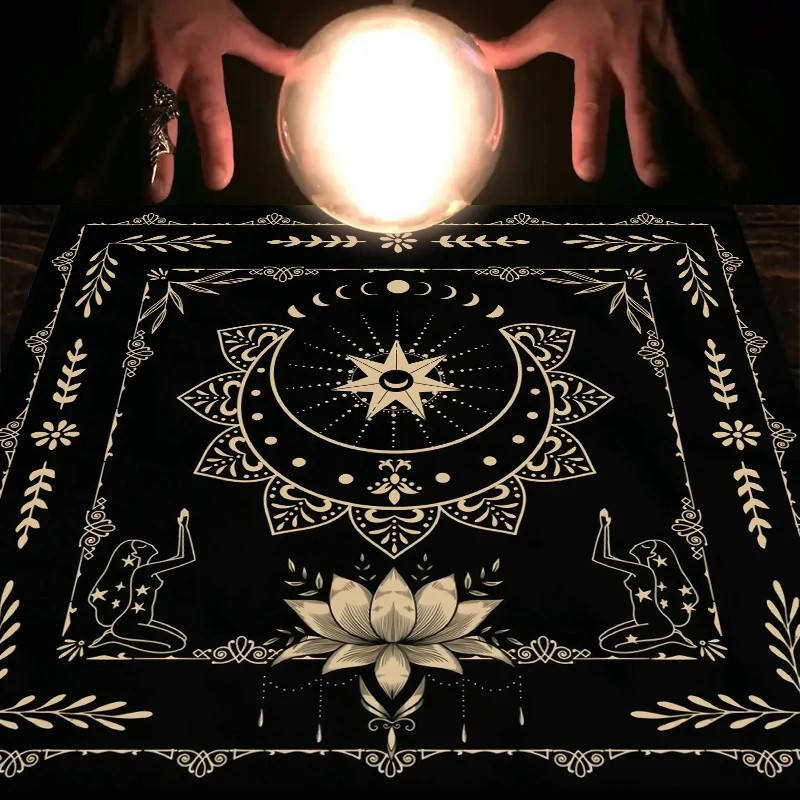 Tovaglia nera elegante con motivi di tarocchi per divinazione, altare o decorazione domestica. Ideale per gli amanti dell'esoterismo e dell'atmosfera mistica. Descrizione completa