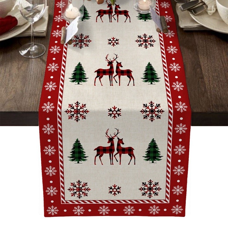 Tovaglia con motivo natalizio. Runner da tavolo. Materiale: lino. Descrizione completa