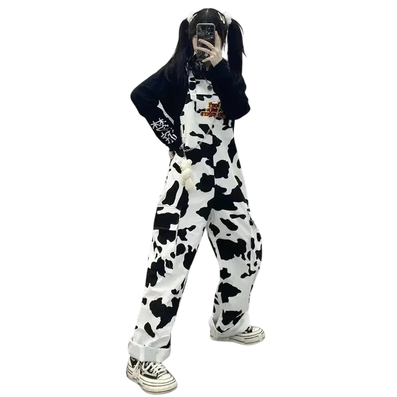 Tuta da donna bianca con pois neri Motivo mucca Scritta dont talk to strangers Tasche Scollo a O Pantaloni lunghi Canotta