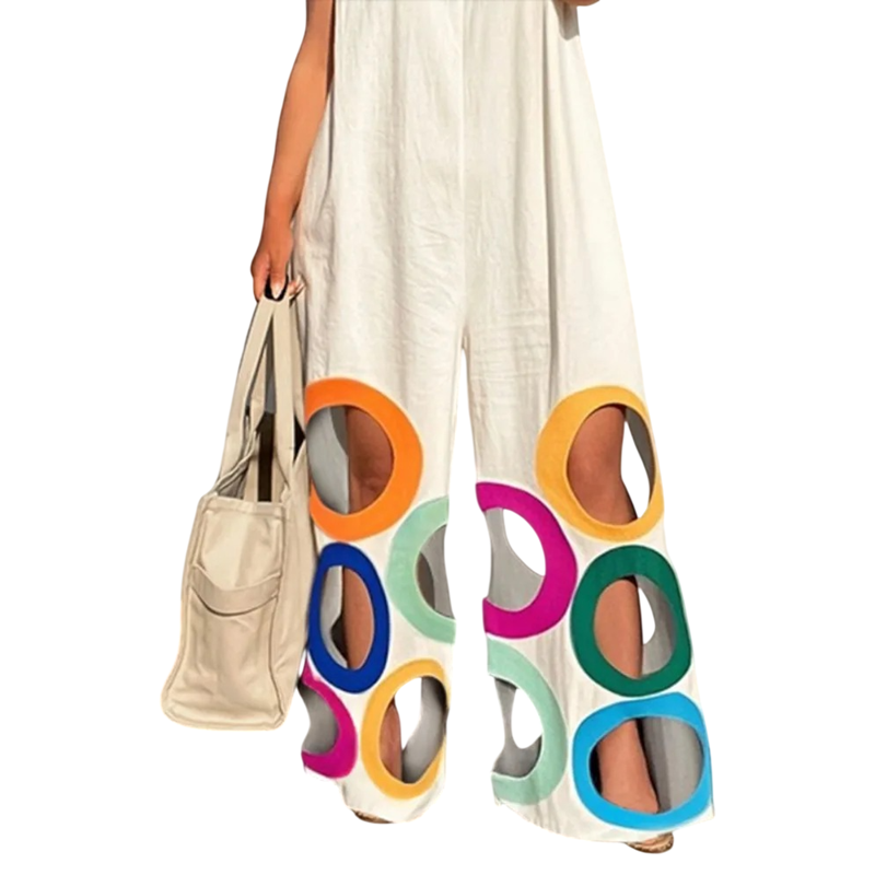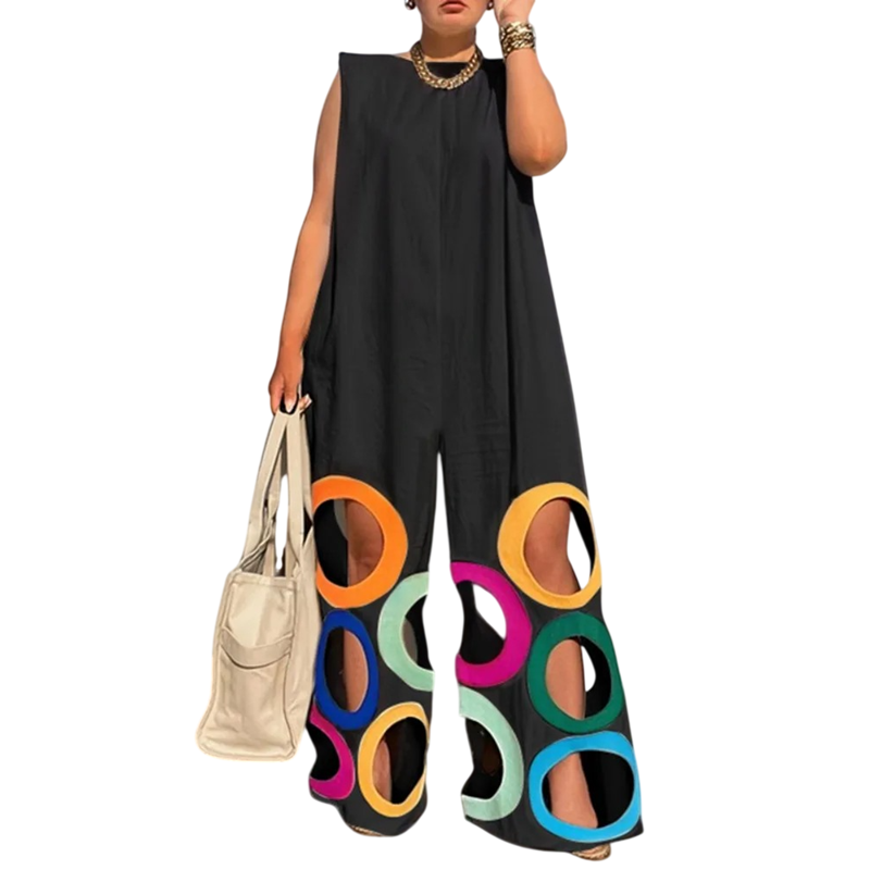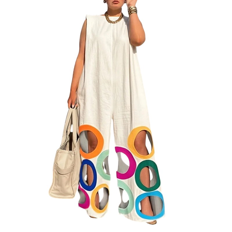 Questa tuta da donna è un pezzo originale e inconfondibile, che si distingue per il design moderno e il massimo comfort. I cerchi perforati nei pantaloni conferiscono leggerezza e ariosità all'outfit, ideale soprattutto per le giornate calde. La scollatura a O appare naturale e delicata, rendendo la tuta facilmente abbinabile a vari accessori. La canotta con spalline larghe garantisce una vestibilità comoda e stabilità senza fastidi. La vestibilità ampia consente un movimento confortevole per tutto il giorno.