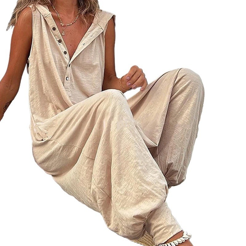 Tuta da Donna Modello Monocromatico Pantaloni Larghi Spalline Larghe Chiusura con Bottone Scollo a V 95% poliestere 5% spandex
