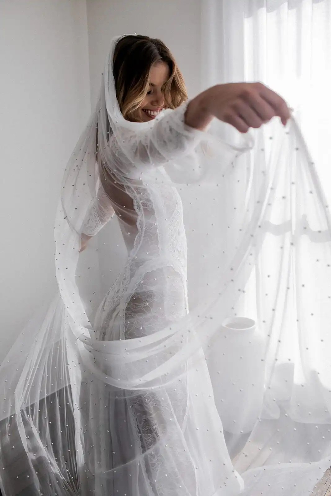 Velum nuziale bianco 250 cm con delicate perle e pettine metallico. Stile Chapel allungato per un ingresso festoso. Descrizione completa